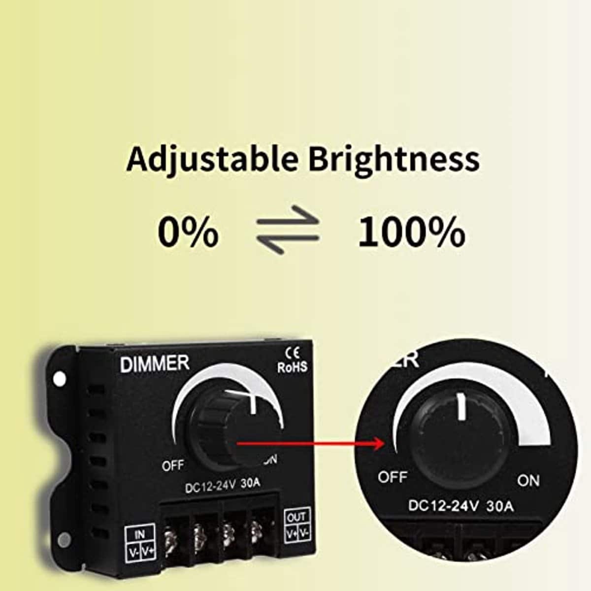 0~ ADJUSTABLE BRIGHTNESS: The light of the LED dimmer switch is soft, stable and flicker-free, and the brightness can be freely adjusted from 0 to 100%. PROTECTION TWERP: When PWM dims digitally, it can prevent power surges, damaging your LED light. EASY TO INSTALL: Easy to use. With a button controller, it is operated manually. The LED switch dimmer also has an automatic memory function, which makes it much easier to use at home. WIDE APPLICATIONS: The dimmer is a constant voltage and constant current output and can also be connected to an amplifier to extend the load, which has a wide range of applications. AFTER-SALES SERVICE: If you are not satisfied with our products, please contact us. I sincerely look forward to having a great meeting with you.