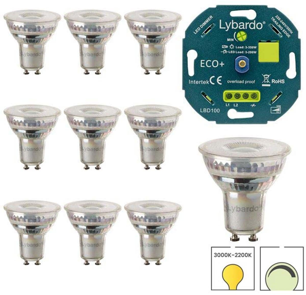 Met deze extra voordelige bundel van 10 dimbare Lybardo 5.5 watt DimTone spots (GUD63022D) in combinatie met de Lybardo LED eco+ dimmer 3-200 watt(LBD100) hoef je niet meer te twijfelen over de juiste combinatie dimmer & lampen.