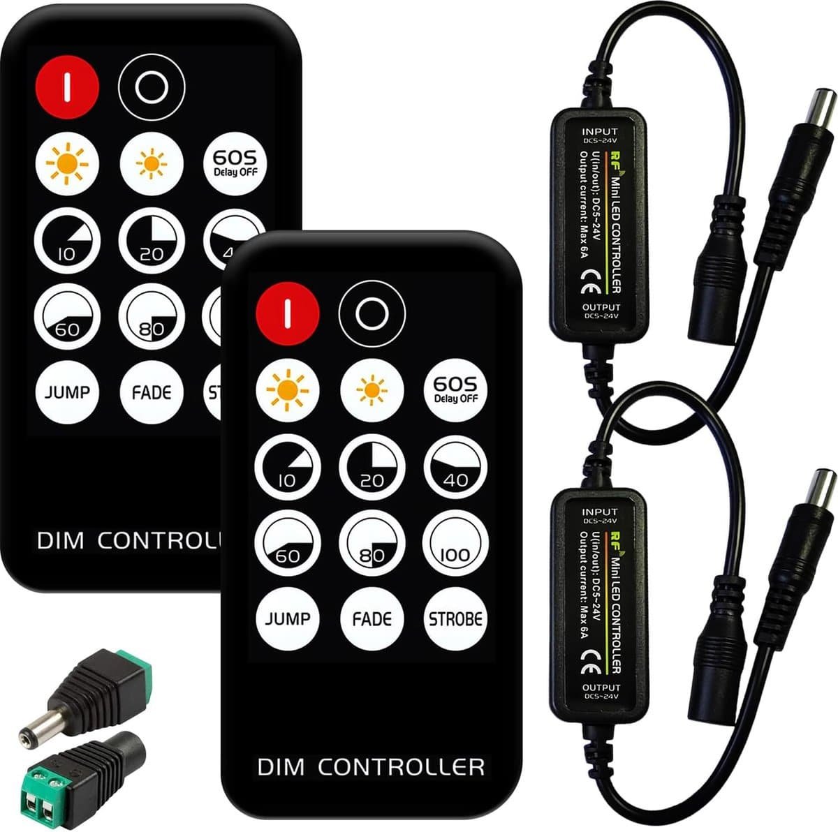 Mini RF dimmer-controller, 2 stuks, 14 toetsen, mini-controller, RF-dimmer, mini-led-controller met 2 conversiekoppen, mini RF led dimmer controller, led RF draadloze afstandsbediening voor