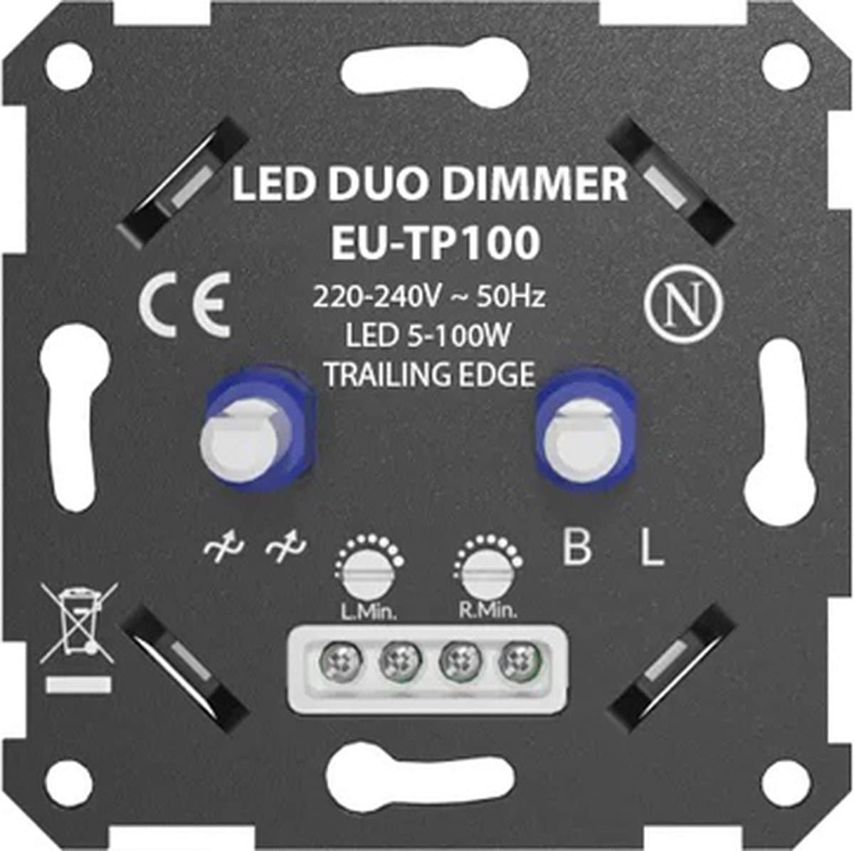 LED duo dimmer is geschikt voor oude en nieuwe installaties. Voorzien van beveiliging tegen overbelasting, piekbelasting korstsluiting en oververhitting met Soft-start voor lamp. Tweedraads aansluiting geen nul of aardedraad nodig. Deze dimmer is niet voorzien van een wissel/ wissel functie. Fase afsnijdimmer inbouw geschikt voor dimbare ledlampen.