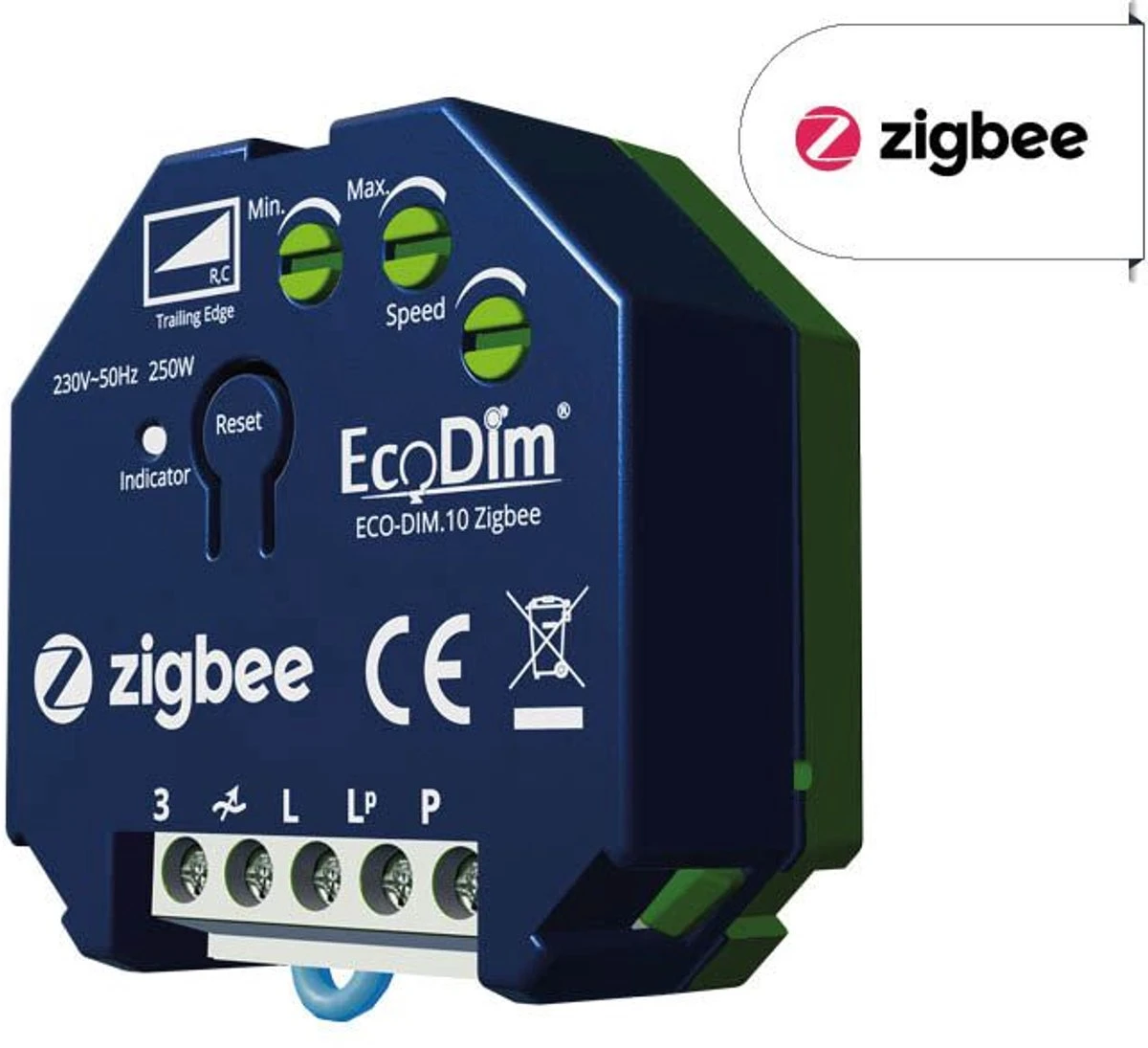 Zigbee led dimmer module ECO-DIM.10 Deze Zigbee dimmer kan worden aangesloten middels de normale 2-draads aansluiting, maar het is ook mogelijk om deze met 3 draden (dus met nuldraad) te installeren. De dimmer kan zowel met een normale pulsschakelaar als via Zigbee domotica bediend worden. En middels Touchlink ook zonder controller/hub te koppelen aan andere Touchlink ondersteunende hardware, zoals de draadloze schakelaars.